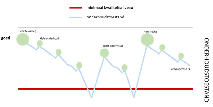 Na verloop van tijd gaat de kwaliteit van de kapitaalgoederen achteruit. De ideale levenscyclus illustreren we in onderstaand figuur. Met klein onderhoud kunnen we de kwaliteit tijdelijk verbeteren. Slijtage gaat echter verder en groot onderhoud is nodig. Na verloop van tijd is vervanging noodzakelijk en begint de cyclus opnieuw. In het figuur zijn de verschillende typen onderhoud (klein onderhoud, groot onderhoud en vervanging) en het effect op de onderhoudstoestand geïllustreerd.