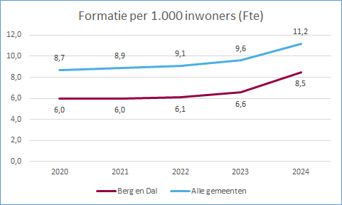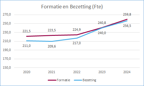 Met het oog op de financiële positie en de uitbreidingen van de afgelopen jaren is ook voor 2026 kritisch gekeken naar de formatie-uitbreidingen. Dit heeft desondanks geleid tot een claim van ongeveer € 0,3 miljoen voor ruim 3,5 fte. Deze uitbreidingen volgen uit de Kadernota 2026 en zijn nodig om wettelijke taken uit te kunnen voeren. De uitbreidingen zijn ingediend om de dienstverlening aan de inwoners te waarborgen. We hebben ook een afname van 6,0 fte door de sluiting van het zwembad. Uit de meest recente personeelsmonitor van het A&O fonds van 2024 blijkt dat wij per 1.000 inwoners 8,5 medewerkers/ 7,2 fte hebben. Dit is bij vergelijkbare gemeenten 8,6 medewerkers en 7,6 fte en bij alle gemeenten 11,2 medewerkers en 10,2 fte.