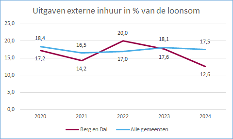 Inzet van de stelpost inhuur blijft noodzakelijk om in te kunnen zetten op extra taken die tijdelijk en specialistisch zijn. Daarnaast zetten we in op vervanging van langdurig zieken en functies die we moeilijk met vaste formatie gevuld krijgen. In 2024 hebben we 12,6 procent van onze loonsom ingezet voor externe inhuur. Wanneer we de inzet van inhuur vergelijken met andere gemeenten, zitten we onder het gemiddelde. Dit terwijl wij ook een lagere bezetting in fte hebben per 1.000 inwoners.